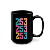 Represent T-Town with serious retro style. The 253 Electric Pop mug features the stacked, vibrant 90s-inspired design on classic black ceramic, bringing Tacoma pride to every sip. Available in 11 oz or 15 oz — perfect for mornings, nights, and everything in between.