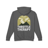 Feel the rush of the ride with our Throttle Therapy hoodie. Showcasing dirt bikers soaring against a rugged mountain backdrop, this hoodie embodies the pure thrill of tearing through the trails.